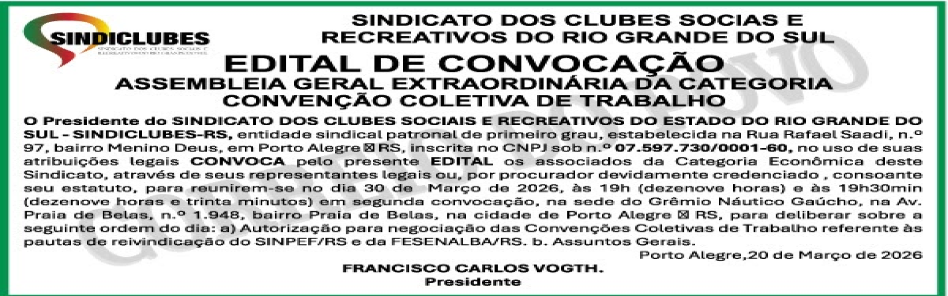 O Presidente do SINDICATO DOS CLUBES SOCIAIS E RECREATIVOS DO ESTADO DO RIO GRANDE DO SUL - SINDICLUBES-RS, entidade sindical patronal de primeiro grau, estabelecida na Rua Rafael Saadi, n.º 97, bairro Menino Deus, em Porto Alegre – RS, inscrita no CNPJ sob n.º 07.597.730/0001-60, no uso de suas atribuições legais CONVOCA pelo presente EDITAL os associados da Categoria Econômica deste Sindicato, através de seus representantes legais ou, por procurador devidamente credenciado , consoante seu estatuto, para reunirem-se no dia 30 de Março de 2026, às 19h (dezenove horas) e às 19h30min (dezenove horas e trinta minutos) em segunda convocação, na sede do Grêmio Náutico Gaúcho, na Av. Praia de Belas, n.º 1.948, bairro Praia de Belas, na cidade de Porto Alegre – RS, para deliberar sobre a seguinte ordem do dia: